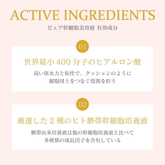 厳選した2種のピュア幹細胞培養液と世界最小400分子ヒアルロン酸を配合。